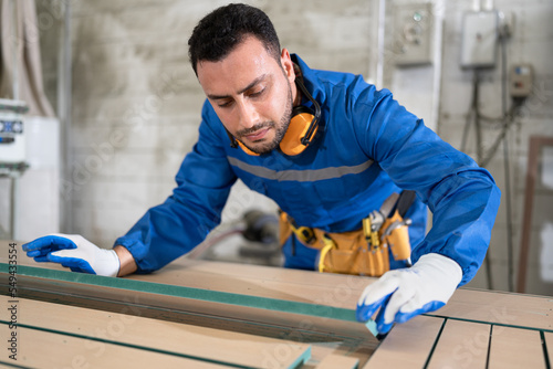 Handsome carpenter in safety uniform checking wood timber at wood factory