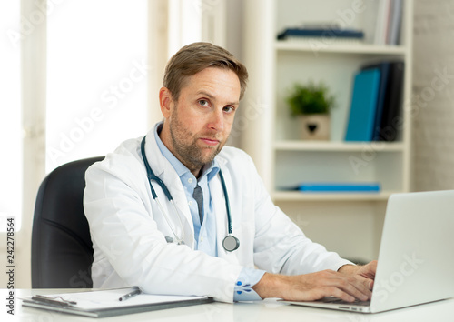 Handsome doctor working on medical expertise and searching information on laptop at hospital office