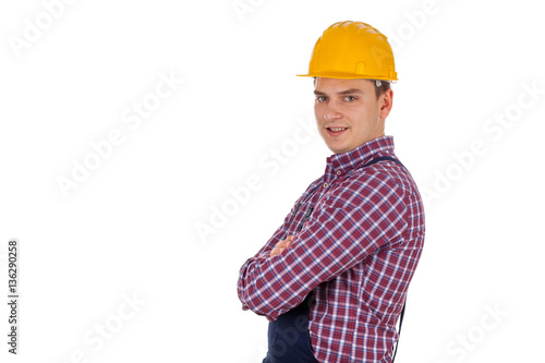 adult, photogenic, male, builder, business, caucasian, arm, construction, engineer, equipment, face, yellow, hat, helmet, human, industrial, isolated, job, attractive, occupation, person, portrait, young, professional, plan, white, confident, work, men at work, employee, to urbanize, contractor, project, sexy, inexperienced, man, security, success, uniform, architect, student, people, protection, graduated, crossed, mechanic, plumber, expert, smiling
