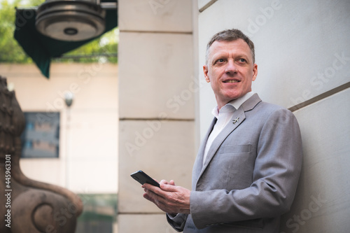 handsome executive manager businessman in suit using touch smart mobile phone to work on cyberspace, confident and successful with cellphone online message, walking in the city