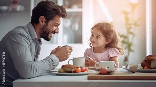 Handsome father with his little cute girl are having breakfast on kitchen. Happy Father's Day.