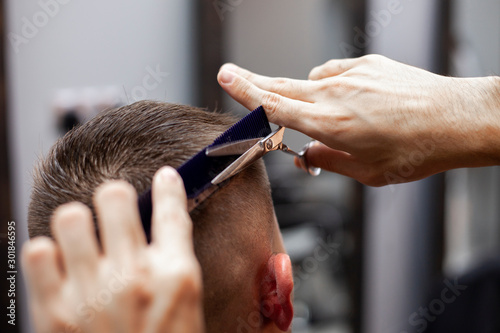handsome guy get a haircut at the hairdresser, Kazakh hairdresser cuts manually with scissors and a comb, short haircut close-up