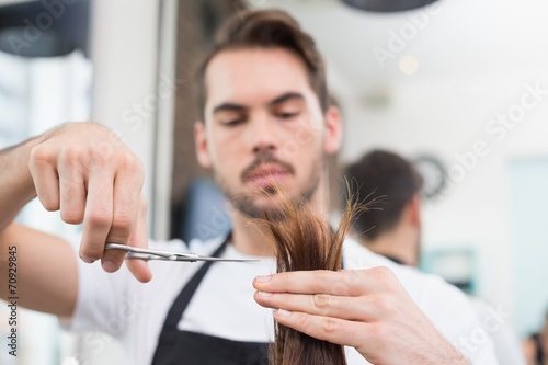 young adult, man, male, caucasian, hair salon, hair care, hairdresser, hairdresser, job, occupation, professional, coiffure, stylish, hair, beauty, industry, small business, attractive, client, sitting, photogenic, haircut, appointment, touching, long hair, cutting, scissors, concentrated, thoughtful, serious, focused, concentrating, indoor, looking down