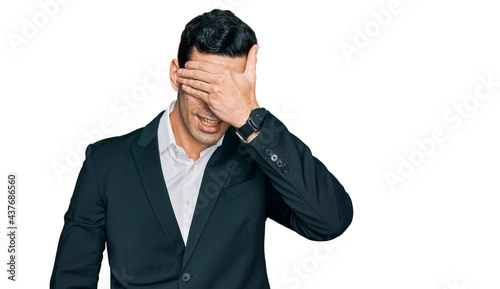 Handsome hispanic man wearing business clothes smiling and laughing with hand on face covering eyes for surprise. blind concept.