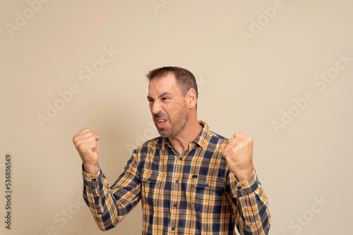 Handsome hispanic man with beard wearing checkered shirt over isolated beige background angry and crazy raising fists frustrated and furious while shouting with anger. Rage and aggressive concept