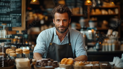 handsome male barista working in coffee shop sitting on counter bartender in apron preparing coffee drink