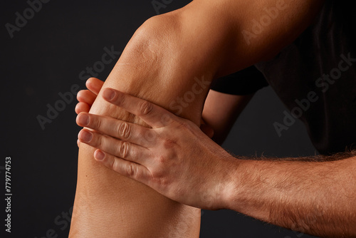 handsome male masseur doing a massage on a girl's leg on a black background, concept of therapeutic relaxing massage