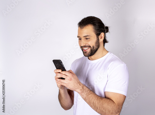Handsome man in a white T-shirt on a white background, smiling, rejoices, in the hands of a smartphone, writes SMS