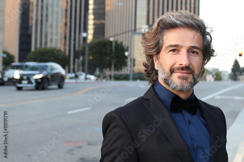tuxedo, man, photogenic, clothing, street, model, shirt, guy, attractive, white, adult, success, male, luxury, evening, bow, black, fashion, suit, portrait, elegant, mature, standing, face, city, person, outdoors, stylish, looking, gentleman, attaching, style, beautiful, background, successful, party, single, alone, coiffure, fashionable, macho, businessman, salt and pepper, hair, grey, beard, bearded, traffic, road, urban