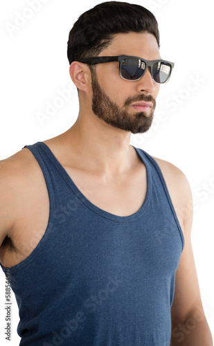 one person, young adult, man, male, studio shot, white background, vest, sunglasses, beard, modern, fashion, fashionable, model, stylish, confident, confidence, attitude, smart, photogenic, attractive, trendy, pose, posing, leisure, lifestyle
