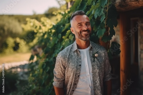 Handsome man smiling at the camera while standing in a vineyard
