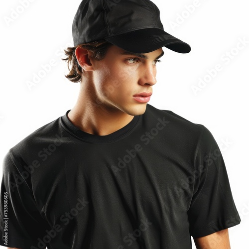 Handsome man wearing blank Black cap and Black t-shirt isolated on white background