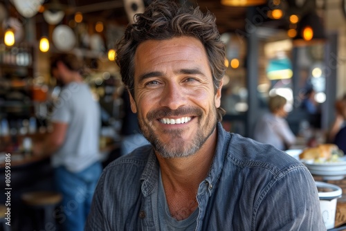 smiling, beard, cafes, man, contentment, happiness, portrait, male, casual attire, lifestyle, confident, poise, relaxed, contemporary, sociable, engaging, personable, welcoming, friendly, attractive, charming, closeup, enjoyment, cheerful, genuine, optimistic, pleasant, inviting, everyday, facial expression, natural, approachable, comfortable, trendy, well-being, joy, brunette