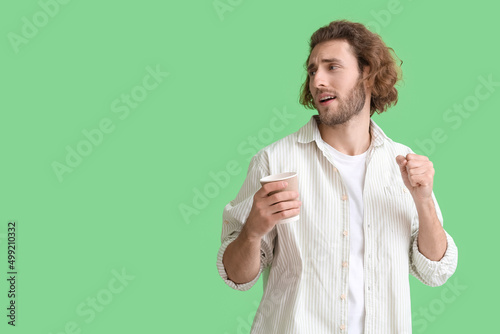 adult, arabica, aroma, attractive, background, bearded, beverage, caffeine, casual attire, caucasian, clothes, hot drink, colours, copy, cup, drink, drinking, energy, espresso, green, photogenic, happy, hot, latte, male, man, modern, natural, organic, people, person, portrait, space, style, stylish, tasty, text, trendy, young