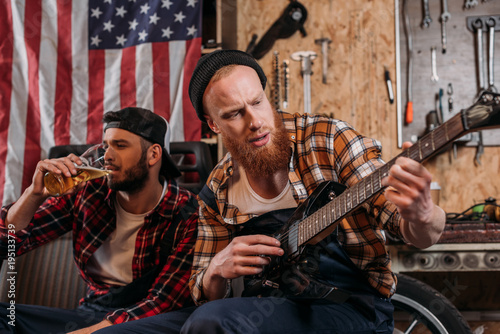 break, play, glasses, equipment, art, people, male, industrial, drink, flag, machine, symbol, service, relax, indoor, beverage, playing, electronic, music, american, us, tool, artistic, profession, alcohol, repair, drunk, attractive, drinking, guitar, photogenic, beer, workshop, mechanic, musician, relaxing, garage, men at work, place, machinery, partner, colleague, alcoholic, masculine, bearded, professional, young adult, us, repair shop