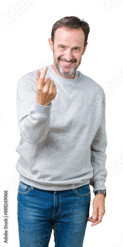 Handsome middle age senior man wearing a sweatshirt over isolated background Beckoning come here gesture with hand inviting happy and smiling