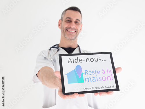 Handsome middle aged male doctor hands an advice written in french on his tablet : "aide-nous, reste à la maison, Covid-19"