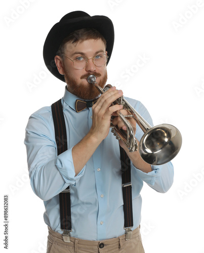 adult, art, artist, background, beard, blowing, blues, brass, caucasian, classic, concert, entertainment, equipment, festival, guy, photogenic, hat, hobby, instrument, isolated, jazz, lifestyle, male, man, melody, metal, music, musical, musician, occupation, orchestra, party, performance, performer, person, play, player, playing, portrait, professional, sound, style, symphony, talent, trumpet, trumpeter, white, wind