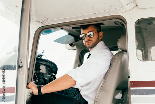handsome pilot in white shirt and sunglasses in plane
