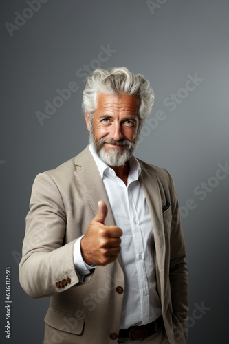 Handsome senior man smiling and showing thumbs up on grey background. Generative AI