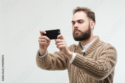 studio, indoor, isolated, portrait, one person, man, male, photogenic, caucasian, long, beard, brunette, style, stylish, shirt, white, background, goggles, young, adult, attractive, boy, casual attire, hipster, eyewear, guy, coiffure, intelligent, fashionable, happy, smile, looking away, sweater, brown, threaded, knitted, cardigan, phone, mobile phone, mobile, communication, copy space, selfie, photographer, smartphone, positive