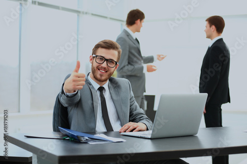 handsome young business man with people in background at office meeting. showing thumbs up.