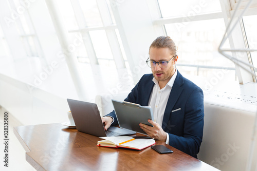 adult, bristle, brutal, calm, casual attire, caucasian, concentrated, confident, employee, focused, photogenic, indoor, inside, job, looking, male, man, masculine, young, modern, 1, person, pleased, posing, office, business, center, serious, smart, unshaved, light, bright, white, laptop, computer, using, network, cyberspace, typing, work, clipboard, paper, document
