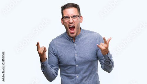 Handsome young elegant man wearing glasses shouting with crazy expression doing rock symbol with hands up. Music star. Heavy concept.