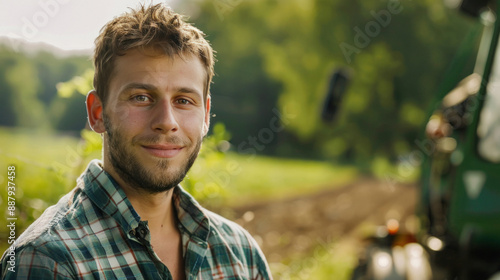 handsome young farmer standing in a shirt and smiling with tractor and nature background.
