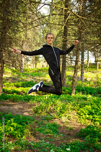 Handsome, young guy in a tracksuit plays sports in the park on the nature. Healthy lifestyle.