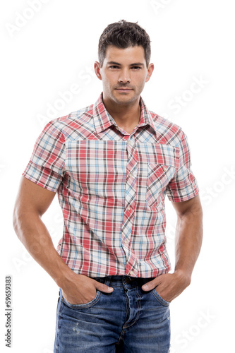 man, happy, photogenic, young, hand, pocket, isolated, portrait, latin, serene, calm, man, male, standing, people, guy, casual attire, caucasian, hispanic, person, adult, white, background, posing, studio, looking, confident, attractive, model, single, 1, boy, jean, cool, cheerful, style, friendly, natural, fashion, youth, positive, content, 30s, front, view