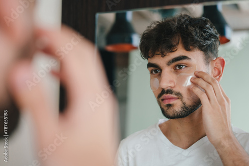 Handsome young man applying cream to his face while looking in the mirror, taking great care of his skin.