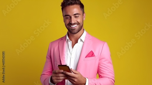 Handsome young man in pink suit using smartphone and smiling while standing against yellow background