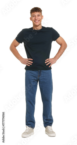 adult, apparel, background, black, blue, casual attire, caucasian, classic, clothes, clothing, colours, cotton, denim, design, elegant, fabric, fashion, fashionable, full-length, garment, guy, photogenic, happy, isolated, jean, jean, lifestyle, male, man, model, modern, outfit, pant, person, portrait, posing, shirt, smiling, sneaker, straight, style, stylish, textile, trendy, vogue, clothes rack, wearing, white