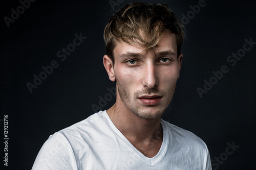 attractive, background, black, blond, caucasian, clothing, confidence, emotion, expressing, face, coiffure, photogenic, human, individuality, male, man, masculine, model, people, person, portrait, posing, studio, style, t-shirt, white, young, youth