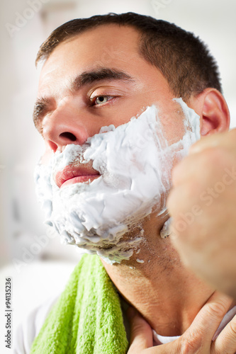Handsome young man is shaving his face