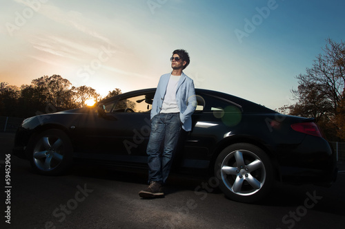 guy, photogenic, gorgeous, car, auto, trendy, modern, man, male, outside, racked, standing, full, length, total, young, stylish, attractive, elegant, pose, posing, macho, cute, palmy, discrete, serious, thoughtful, sundown, twilight, sunrise, 1, single, black, fashion, style, expression, sunlight
