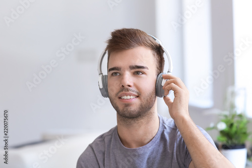 Handsome young man listening to music at home