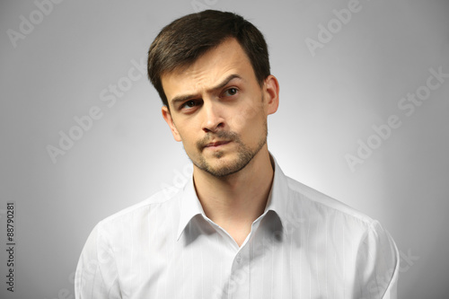 adult, attractive, background, beauty, business, casual attire, clothing, concept, copy, cute, elegant, emotional, emotion, expression, expressive, fashion, grey, grey, guy, hair, photogenic, human, idea, lifestyle, male, man, model, modern, 1, people, person, photo, portrait, pose, posing, posture, pretty, professional, shirt, studio, style, stylish, success, successful, young