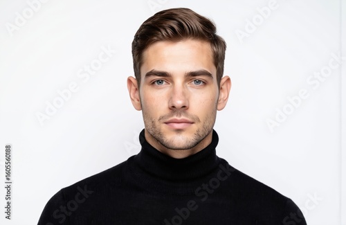 Handsome young man portrait, wearing black turtleneck sweater, smiling gently. Clean cut, blue eyes, short brown hair. Isolated on clean white background, presenting pro, modern look for fashion