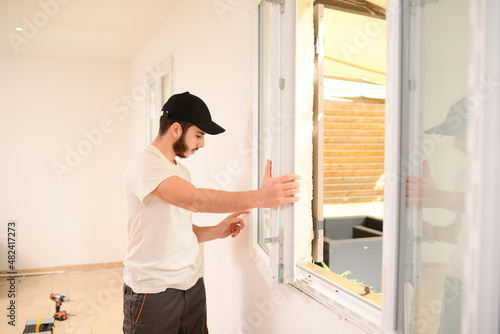 handsome young professional man installing and replacing a new home window in client house for improvement energy saving efficiency isolation