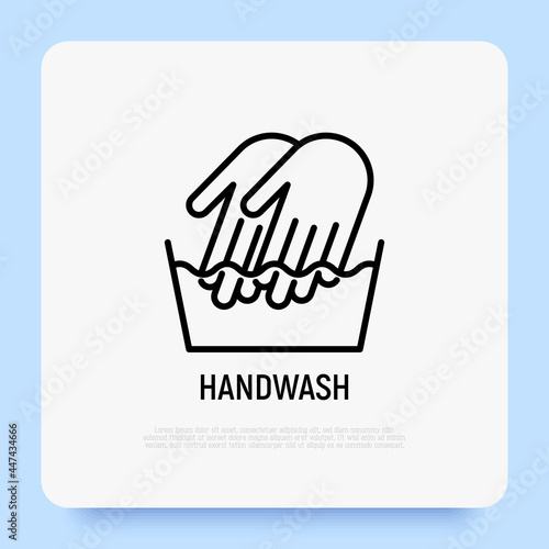 Handwash symbol: two hands in wash bowl. Thin line icon. Modern vector illustration.