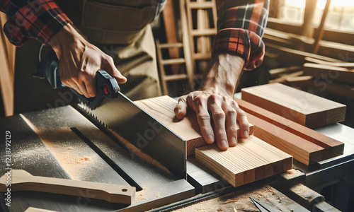 Handwerker mit Säge und Werkzeug bei Holzarbeiten, Schreiner, close-up