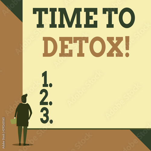 Handwriting text Time To Detox. Conceptual photo when you purify your body of toxins or stop consuming drug Back view young woman watching blank big rectangle. Geometrical background