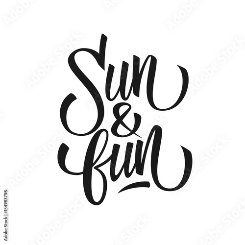 Handwritten phrase Sun and Fun. Hand drawn lettering. Calligraphic element for your design. Vector illustration.