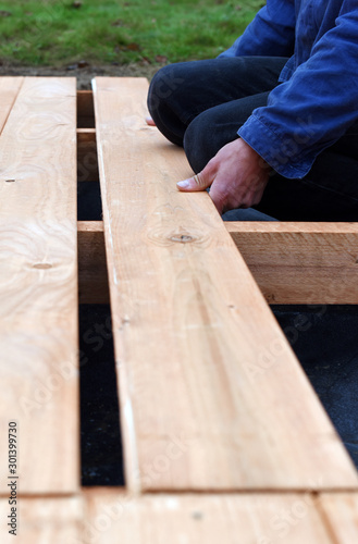 Handy carpenter installing wooden planks during flooring works outside the new house. Czech republic, Europe.