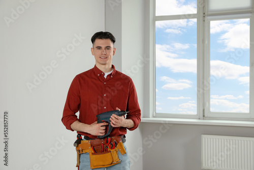 Handyman with electric screwdriver and tool belt in empty room