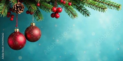Hanging Christmas ornament set with pinecones and berries on blue background, Christmas ornaments, pinecones, greenery