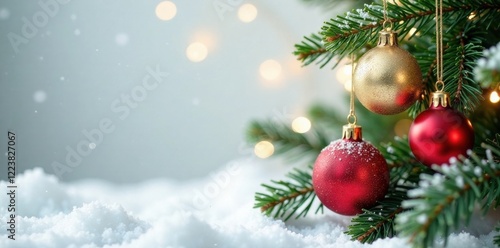 Hanging Christmas tree ornaments in gold on a snowy white background, ornaments, gold