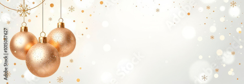 Hanging golden Christmas tree balls on a light festive background. Banner with space for text